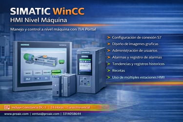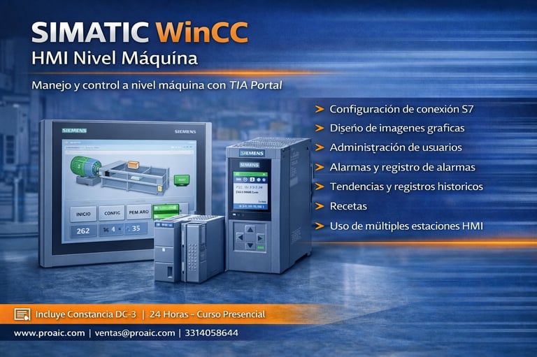 Curso enfocado en la creación y configuración de interfaces HMI a nivel máquina utilizando SIMATIC WinCC en TIA Portal. Se desarrollan competencias en diseño de pantallas, alarmas, tendencias, recetas y comunicación con controladores S7-1200/1500 en aplicaciones industriales estándar.