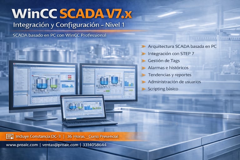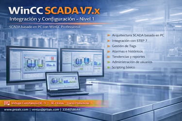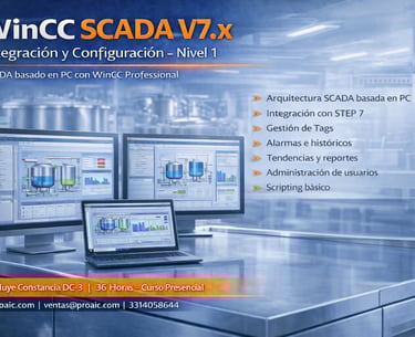 Curso enfocado en la configuración e integración de sistemas SCADA basados en PC utilizando WinCC Professional V7.x. El participante desarrollará competencias en diseño gráfico, gestión de tags, alarmas, históricos, reportes y scripting, integrando sistemas SIMATIC en arquitecturas industriales reales.