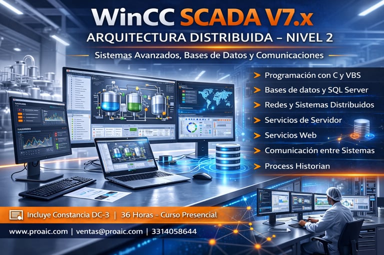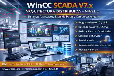 Curso avanzado orientado al desarrollo e integración de sistemas SCADA distribuidos con WinCC Professional V7.x. Se abordan funciones avanzadas con C y VBS, bases de datos, redes, servidores, servicios web y Process Historian para arquitecturas industriales complejas.
