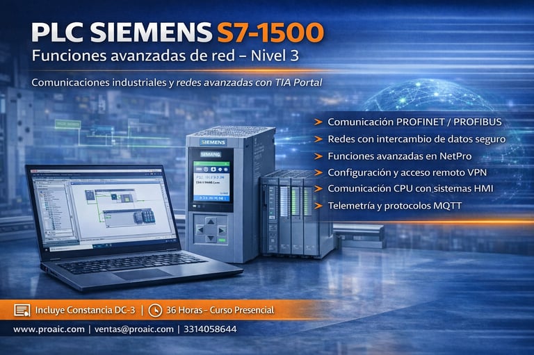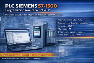 Curso dirigido a profesionales que buscan dominar recursos avanzados del S7-1500, incluyendo reusabilidad de bloques, direccionamiento indirecto, diagnóstico profesional (ProDiag) e integración en redes industriales. Se enfoca en optimización, arquitectura robusta y aplicaciones de alta complejidad.