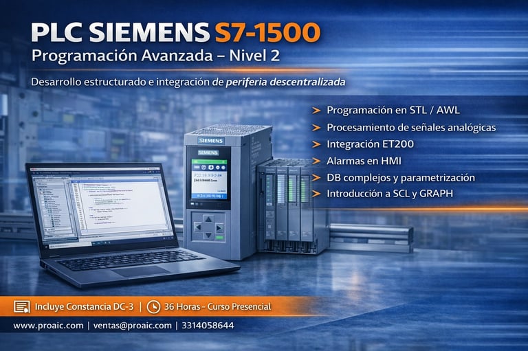 Enfocado en programación estructurada avanzada, procesamiento de señales analógicas e integración de ET200. El participante fortalece habilidades en STL/AWL, parametrización de bloques complejos, alarmas en HMI y fundamentos de SCL y GRAPH, aplicados a proyectos industriales reales.