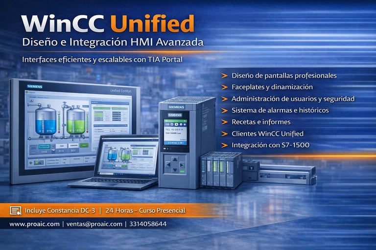 Curso orientado al diseño, configuración e integración de sistemas HMI basados en WinCC Unified dentro del entorno TIA Portal. El participante desarrollará habilidades para crear interfaces avanzadas, administrar usuarios, configurar alarmas, históricos, recetas e implementar soluciones en paneles Unified o estaciones PC industriales.