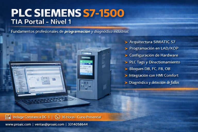 Curso orientado a técnicos e ingenieros que desean iniciar en la programación de PLC Siemens S7-1500. Se desarrollan competencias en arquitectura SIMATIC, configuración de hardware, programación en LAD/KOP, manejo de bloques y diagnóstico básico, integrando HMI Comfort en un entorno industrial real.